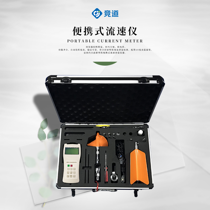 便携式流速仪主要由旋桨式流速传感器、流速测算仪、测杆组成。全套仪器置于高级铝合金密码箱内。接通信号线,即可进行各明渠中流速的测量,并自动显示流速。